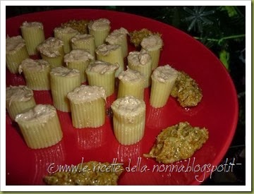 Quando non ho i mezzi rigatoni, non faccio altro che tagliare i rigatoni lessati a metà: dopo basta riempirli con una salsina ottenuta con tonno pescato da Omar, capperi, maionese e alici in salsa piccante Rizzoli e servirli accompagnando il tutto con paté di carciofi.